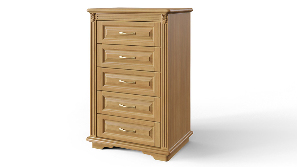 Универсальный предмет мебели — изысканный и функциональный комод — колонка «Палермо» занимает немного места в интерьере спальни или домашнего кабинета, благодаря своим компактным размерам. Пять вместительных выкатных ящиков оснащены телескопическими направляющими в базовой комплектации и направляющими с системой довода опционально. Разнообразие цветовых решений на массиве бука и ясеня позволяет легко дополнить интерьер любых цветовых решений. Сборка не требуется.