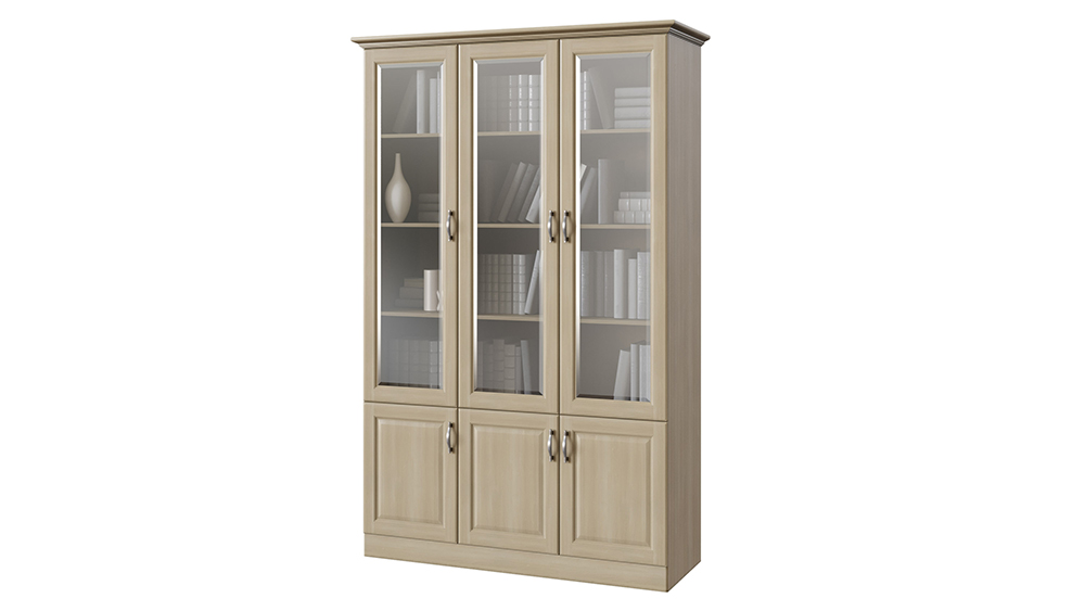 Трёхстворчатый шкаф библиотека коллекции Эдем в классическом стиле — это не только удобное место хранения, но и красивый предмет декора интерьера. Ведь на полках можно создать красивую композицию из книг с похожими по цвету обложками, интерьерными статуэтками или другими вещами, а через стеклянные дверки шкафа их будет хорошо видно, но при этом они будут защищены от попадания пыли. А в нижних ящиках шкафа можно удобно расположить документы и другие вещи, которые вам хотелось бы спрятать с видного места. Шкаф может быть выполнен полностью из натурального массива бука или ясеня или же, при желании немного удешевить изделие, мы можем изготовить боковины шкафа из ЛДСП. Обращаем ваше внимание, что такое решение никак не повлияет на визуальный вид товара. Внешние габариты библиотеки: 8 см. к ширине по внешним габаритам карниза. Требуется сборка.