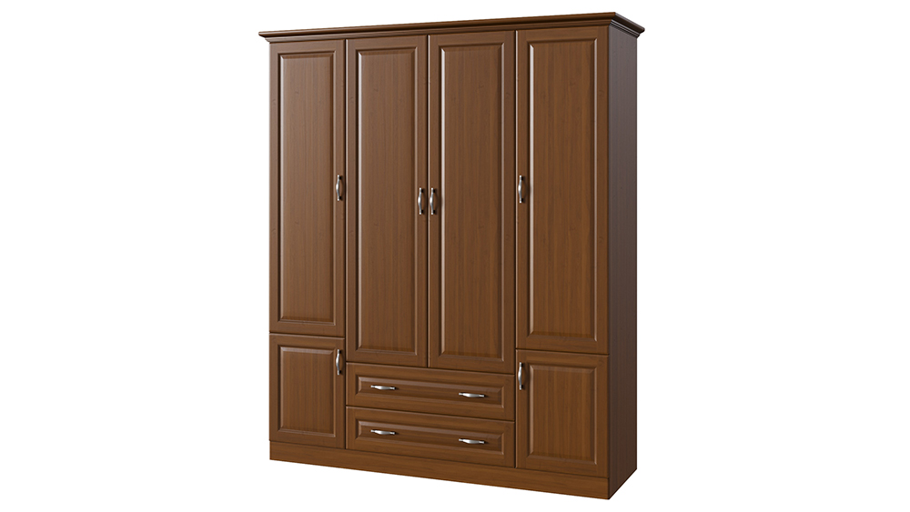 Классический шкаф, созданный в едином стиле с коллекцией Эдем — изделие без которого не возможно себе представить спальню. Корпус шкафа может быть изготовлен как из массива бука и ясеня, так и из массива мягколиственных пород, что делает его стоимость еще более демократичной. Четырех створчатый шкаф имеет 3 базовые комплектации: c антресольной секцией в верхней (4-3) или нижней части (4-1) шкафа или двумя выкатными ящиками (4-2) в нижней части шкафа. В стандартном оснащении двух створчатая секция шкафа располагается по центру шкафа и имеет два выкатных ящика. Фасады шкафа могут иметь встроенные зеркала, как на лицевой части фасада — по размеру филенчатой части, так и на внутренней стороне фасада. Распашные дверцы шкафа оснащены петлями с системой до-закрытия в базовой комплектации. В широкой центральной секции шкафа предусмотрена штанга для плечиков, а в малых секциях предусмотрены полки для хранения вещей. По желанию шкаф может быть оснащен любым количеством полок.