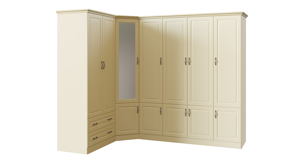 Малогабаритный и чревычайно вместительный шкаф, созданный в едином стиле с коллекцией Эдем. Корпус шкафа может быть изготовлен как из массива бука и ясеня, так и из массива мягколиственных пород, что делает его стоимость еще более демократичной. Угловой шкаф изготавливается в одной комплектации: c антресольной секцией в нижней части шкафа. Одностворчатый шкаф идеально подходит для составления мебельных композиций в качестве углового модульного элемента. На визуализации представлен пример вхождения углового шкафа в состав вместе с двухстворчатым и четырёхстворчатым шкафами из коллекции Эдем, объединёнными под единым карнизом вверху и цоколем внизу. Фасады шкафа могут иметь встроенные зеркала, как на лицевой части фасада — по размеру филенчатой части, так и на внутренней стороне фасада. Распашные дверцы шкафа оснащены петлями с системой дозакрытия в базовой комплектации. В большей секции шкафа предусмотрена штанга для плечиков. По желанию шкаф может быть оснащен любым количеством полок.