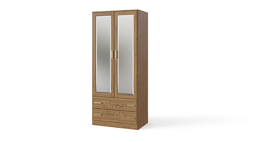 Шкаф производится с антресолью в верхней или нижней части шкафа, а также с двумя выкатными ящиками. В стандартном исполнении в большей створке - зеркало с фацетом, выполняет роль филенки в фасаде, по желанию возможна установка дверей из 100 % массива дерева. Корпус шкафа изготавливается только из массива бука или ясеня. Двухстворчатый шкаф – это достаточно вместительный элемент мебели спальни Веро. Авторская резьба на фасадах шкафа делает его произведением мебельного искусства. Распашные дверцы шкафа оснащены петлями с системой дозакрытия в базовой комплектации, а выкатные ящики – телескопическими направляющими. В большей секции шкафа предусмотрена штанга для плечиков. По желанию шкаф может быть оснащен любым количеством полок. Стандартно предусмотрено три комлектовки шкафа: с антресольной секцией вверху или внизу шкафа, а так-же с двумя выкатными ящиками. Требуется сборка.
