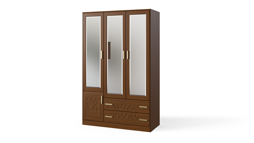 Шкаф Веро трехстворчатый производится с антресолью в верхней или нижней части шкафа, а также с двумя выкатными ящиками. В стандартном исполнении в большей створке шкафа располагается зеркало с фацетом, которое выполняет роль филенки в фасаде, по желанию возможна установка дверей из 100 % массива дерева. Корпус шкафа изготавливается только из массива бука или ясеня. Трехстворчатый шкаф – это очень функциональный, удобный и красивый элемент мебели для спальни Веро, безусловный лидер продаж в сегменте шкафов. Авторская резьба на фасадах шкафа делает его произведением мебельного искусства. Распашные дверцы шкафа оснащены петлями с системой дозакрытия в базовой комплектации, а выкатные ящики – телескопическими направляющими. В большей секции шкафа предусмотрена штанга для плечиков. По желанию шкаф может быть оснащен любым количеством полок. Стандартно предусмотрено три комлектовки шкафа: с антресольной секцией вверху или внизу шкафа, а так-же с двумя выкатными ящиками. Требуется сборка.