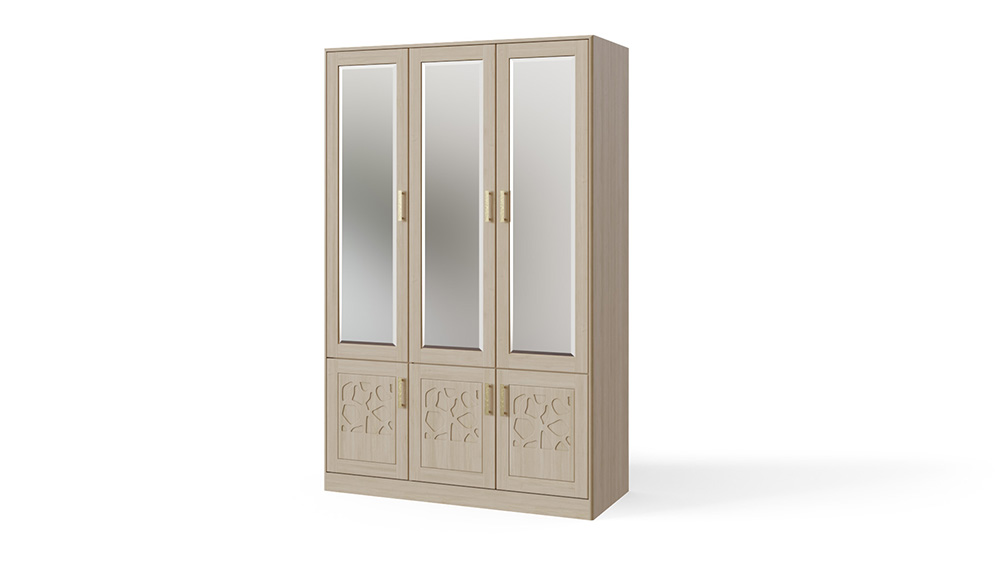 Шкаф Веро трехстворчатый производится с антресолью в верхней или нижней части шкафа, а также с двумя выкатными ящиками. В стандартном исполнении в большей створке шкафа располагается зеркало с фацетом, которое выполняет роль филенки в фасаде, по желанию возможна установка дверей из 100 % массива дерева. Корпус шкафа изготавливается только из массива бука или ясеня. Трехстворчатый шкаф – это очень функциональный, удобный и красивый элемент мебели для спальни Веро, безусловный лидер продаж в сегменте шкафов. Авторская резьба на фасадах шкафа делает его произведением мебельного искусства. Распашные дверцы шкафа оснащены петлями с системой дозакрытия в базовой комплектации, а выкатные ящики – телескопическими направляющими. В большей секции шкафа предусмотрена штанга для плечиков. По желанию шкаф может быть оснащен любым количеством полок. Стандартно предусмотрено три комлектовки шкафа: с антресольной секцией вверху или внизу шкафа, а так-же с двумя выкатными ящиками. Требуется сборка.