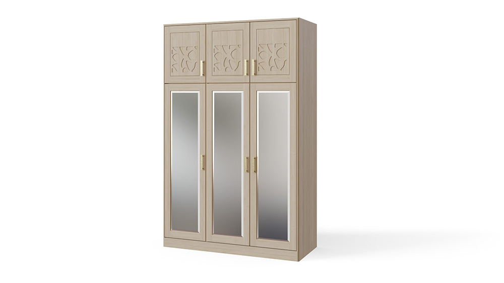 Шкаф Веро трехстворчатый производится с антресолью в верхней или нижней части шкафа, а также с двумя выкатными ящиками. В стандартном исполнении в большей створке шкафа располагается зеркало с фацетом, которое выполняет роль филенки в фасаде, по желанию возможна установка дверей из 100 % массива дерева. Корпус шкафа изготавливается только из массива бука или ясеня. Трехстворчатый шкаф – это очень функциональный, удобный и красивый элемент мебели для спальни Веро, безусловный лидер продаж в сегменте шкафов. Авторская резьба на фасадах шкафа делает его произведением мебельного искусства. Распашные дверцы шкафа оснащены петлями с системой дозакрытия в базовой комплектации, а выкатные ящики – телескопическими направляющими. В большей секции шкафа предусмотрена штанга для плечиков. По желанию шкаф может быть оснащен любым количеством полок. Стандартно предусмотрено три комлектовки шкафа: с антресольной секцией вверху или внизу шкафа, а так-же с двумя выкатными ящиками. Требуется сборка.