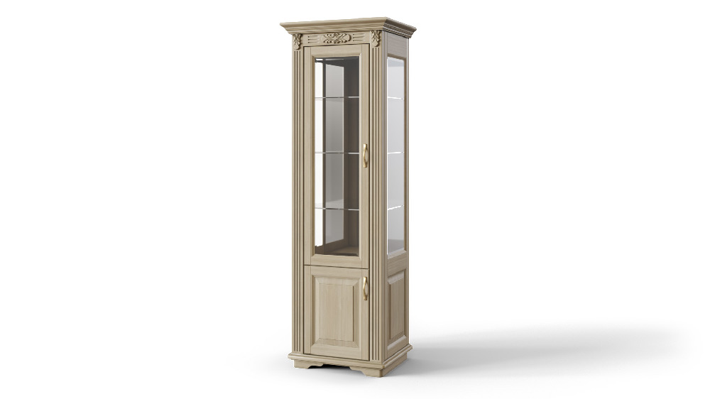 Одностворчатые, двухстворчатые и трехстворчатые витрины для гостинной «Палермо», изготовленные из массива бука или ясеня со стеклянными боковыми стенками и фасадами рамочной конструкции со стеклом, обработанным фацетом. Витрина имеет четыре стеклянные полки, задняя стенка имеет в своей конструкции два соединенных зеркала, которые делают интерьер более легким и изысканным. В базовой комплектации витрины оснащаются выкатными ящиками или опционально под заказ - распашными створками. Изысканная классика — вот стиль витрины и интерьера «Палермо».
