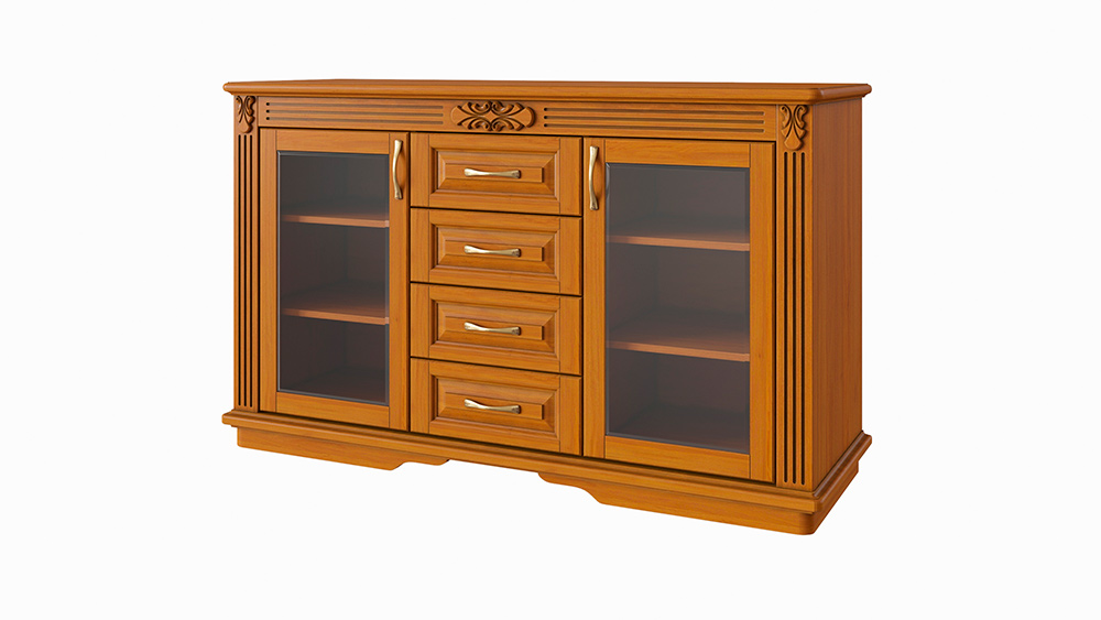 Комод Греденция Палермо на 4 ящика - это прообраз известных всем кабинета, серванта, комода и другой многофункциональной мебели. Эта мебель может быть изготовлена из массива бука или ясеня на Ваш выбор, в классическом стиле, идеально впишется в интерьер гостиной или кабинета, в ней удобно хранить, как небольшие предметы – для этого есть 4 выдвижных ящика, так и посуду – благодаря двум вместительным отсекам с полками за стекляными дверцами.